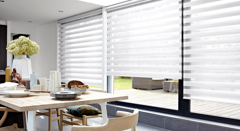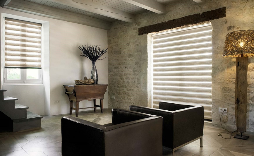 Assembled in the roller system with double fabric simultaneously, horizontally located and held in the middle of two Sheer veils.