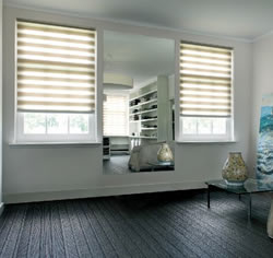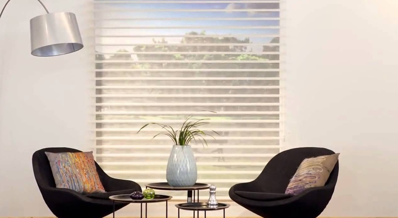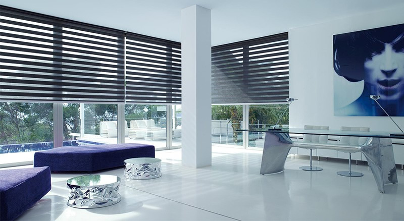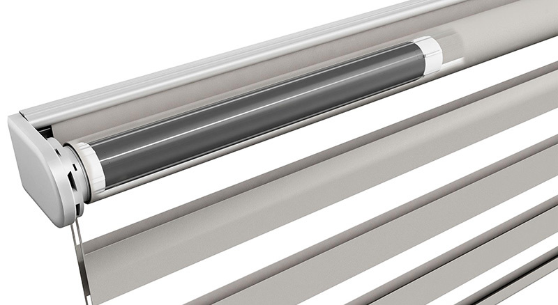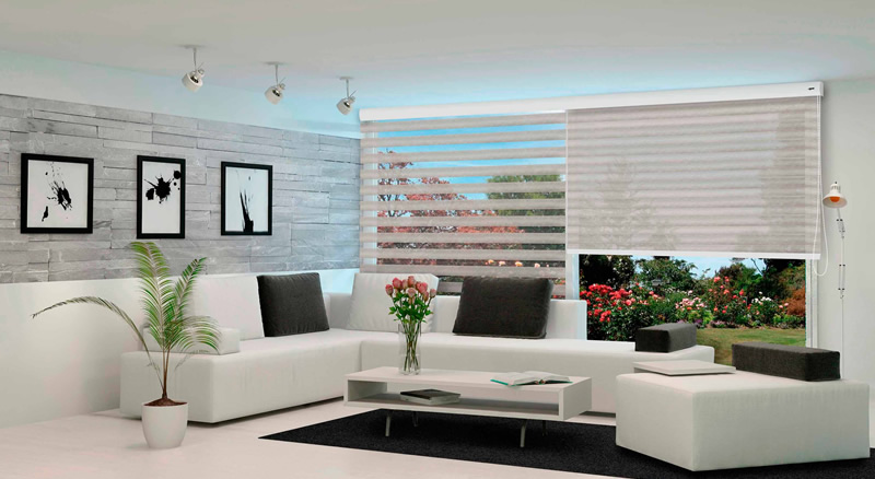 Ensamblada en el sistema enrollable con doble tela simultáneamente, ubicadas horizontamente y sostenidas en medio de dos velos Sheer.
